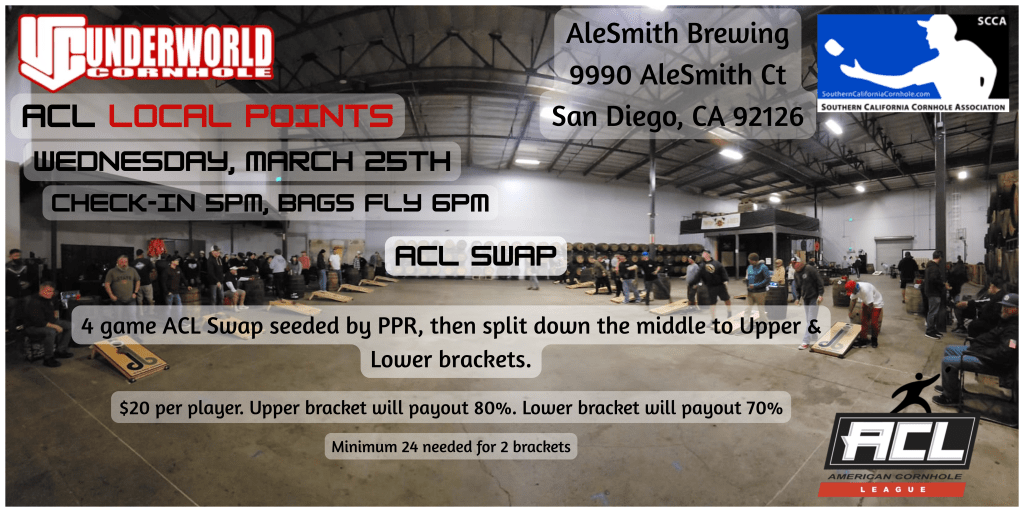 Indoors at AleSmith brewing, we will run a 4 game round-robin ACL Swap and rank by PPR through those 4 games. List will then be split down the middle for Upper & Lower playoff brackets.
